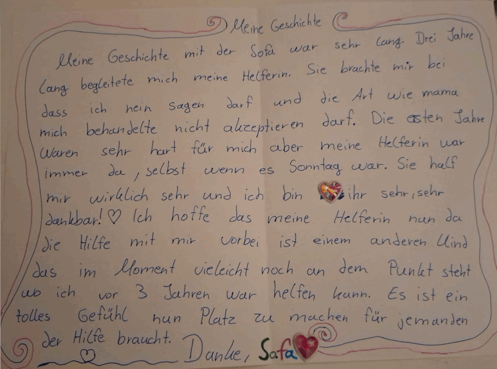 Mein Ziel für Zuhause ist, dass ich nicht zurück muss. Ich habe eine neue Chance bekommen und möchte die auf jeden Fall nutzen. Ich habe vieles gelernt, zum Beispiel wie ich mit meinen Gefühlen umgehen kann, wie ich neue Freunde finde oder aber mein Zimmer ordentlich halte und glaube, dass ich es schaffen kann. Ich möchte Mama unterstützen und mich an die Regeln halten.